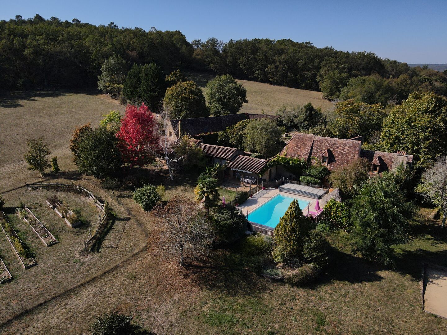 Ensemble Perigordin avec Maison Principale, 2 gites, piscine et terrain de plus de 6 ha.