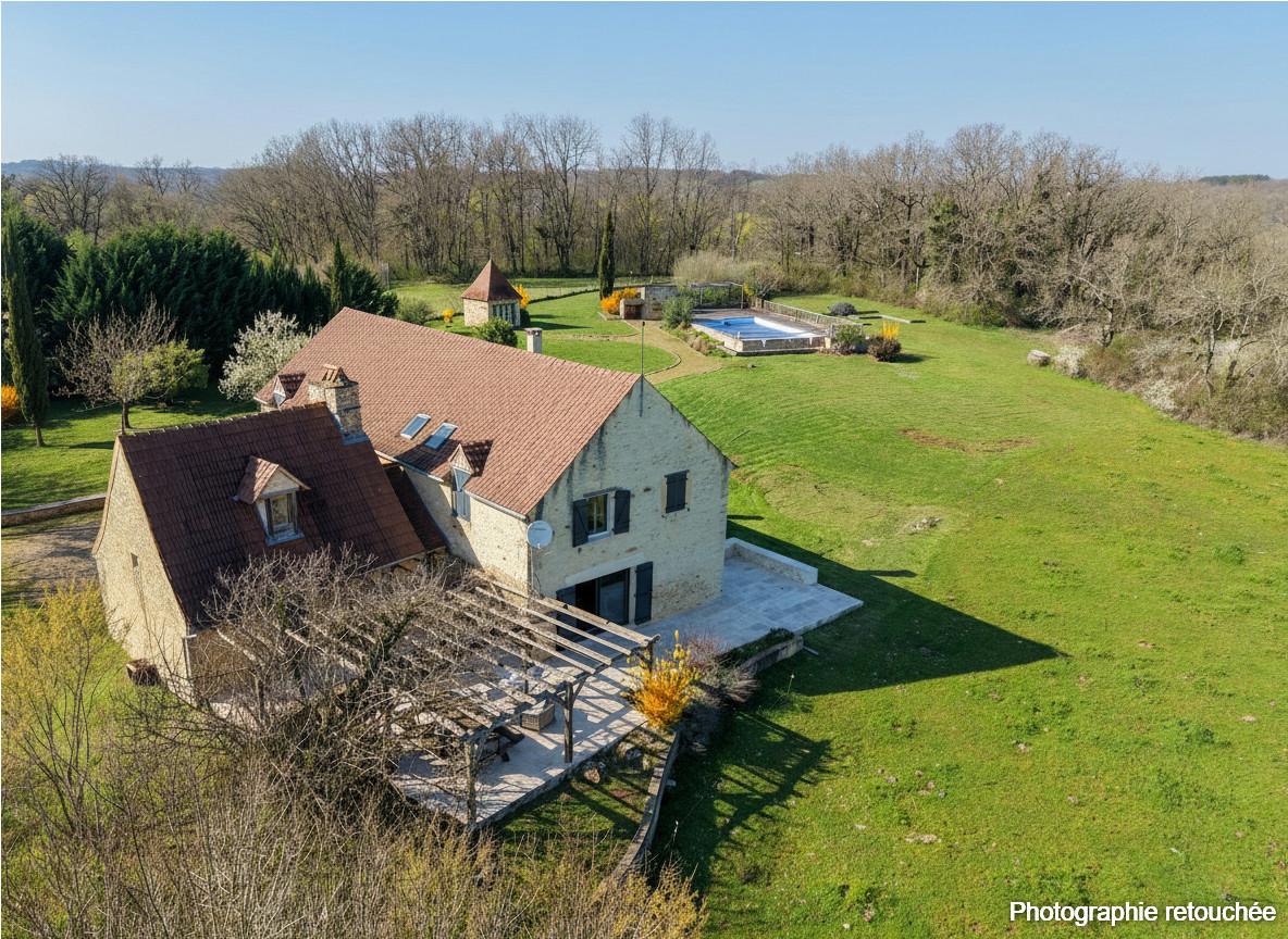 EXCLUSIVITE - Secteur Gourdon - Au calme, en situation dominante privilégiée sur 2 ha63 avec vue imprenable et piscine , cet ancien Corps de Ferme a été rénové en reliant les deux parties pour une surface habitable de 245 m² - restauration de charme privilégiant de spacieux et lumineux espaces de vie dont 6 chambres et grand séjour avec cheminée. Terrasse avec vue panoramique, Proche commerces. La Maison. RDC. 2 entrées dont une par la chambre/bureau de 20 m² et une par le salon de 30 m² avec cheminée cantou (poêle) de l'ancienne maison, dégagement de 11 m² accèdant à l'étage, wc avec lave-mains de 2,4 m², séjour/sam de 50 m² avec cheminée (poêle), cuisine équipée de 16 m², arrière-cuisine de 8 m² avec accès extérieur, dégagement de 2,3 m², salle d'eau avec wc de 5 m². Espace rangement de 5 m² derrière la chambre de plain-pied. Etage. Partie 1 - Pièce palière de 30 m² avec placard de rangement, 4 chambres dont 1 de 14,5 m², salle de bains avecwc de 6 m², 1 de 15,5 m² avec salle d'eau wc de 4,8 m², chambre de 20,5 m² avec salle d'eau wc de 3,27 m², chambre de 15 m² avec salle d'eau wc. Partie 2 - Chambre de 15 m² avec placards en N+1 de l'ancienne maison. Fosse toutes eaux aux normes. Chauffage au bois (poêles) en rdc et électrique à l'étage. Double vitrage. Four à pains. Pigeonnier à usage de rangement. Piscine de 11 x 6 au chlore avec plages. Les informations sur les risques auxquels ce bien est exposé sont disponibles sur le site Géorisques www.georisques.gouv.fr