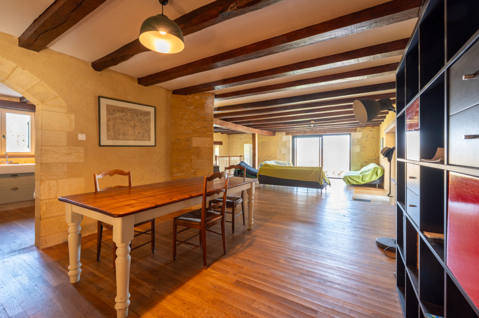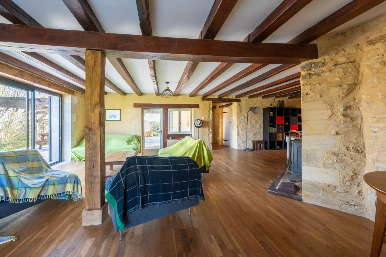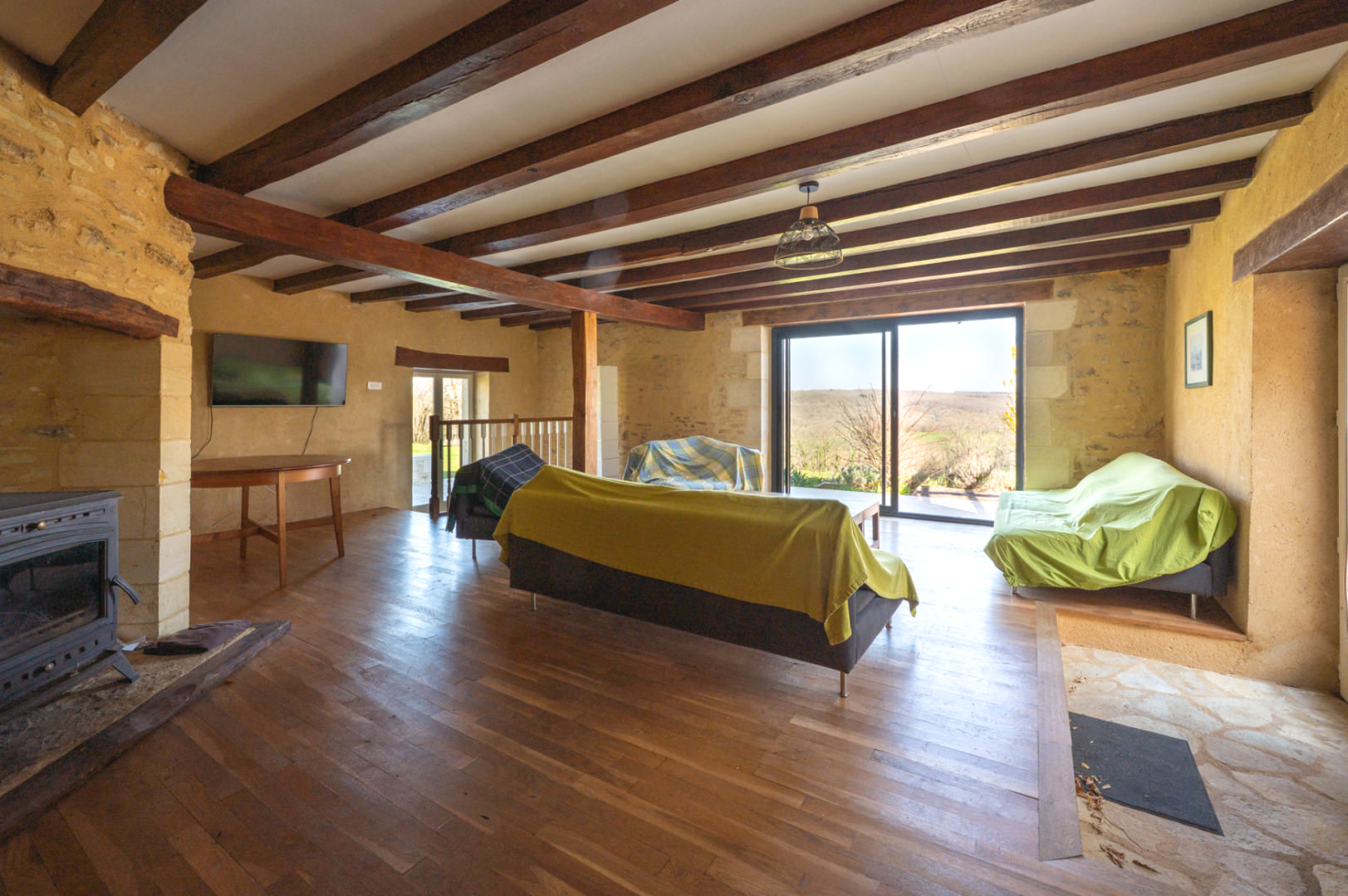 - Salon(s) maison en pierre attenante - salon de 30 m² avec cheminée (poêle) et chambre à l'étage de 15 m² avec placards
