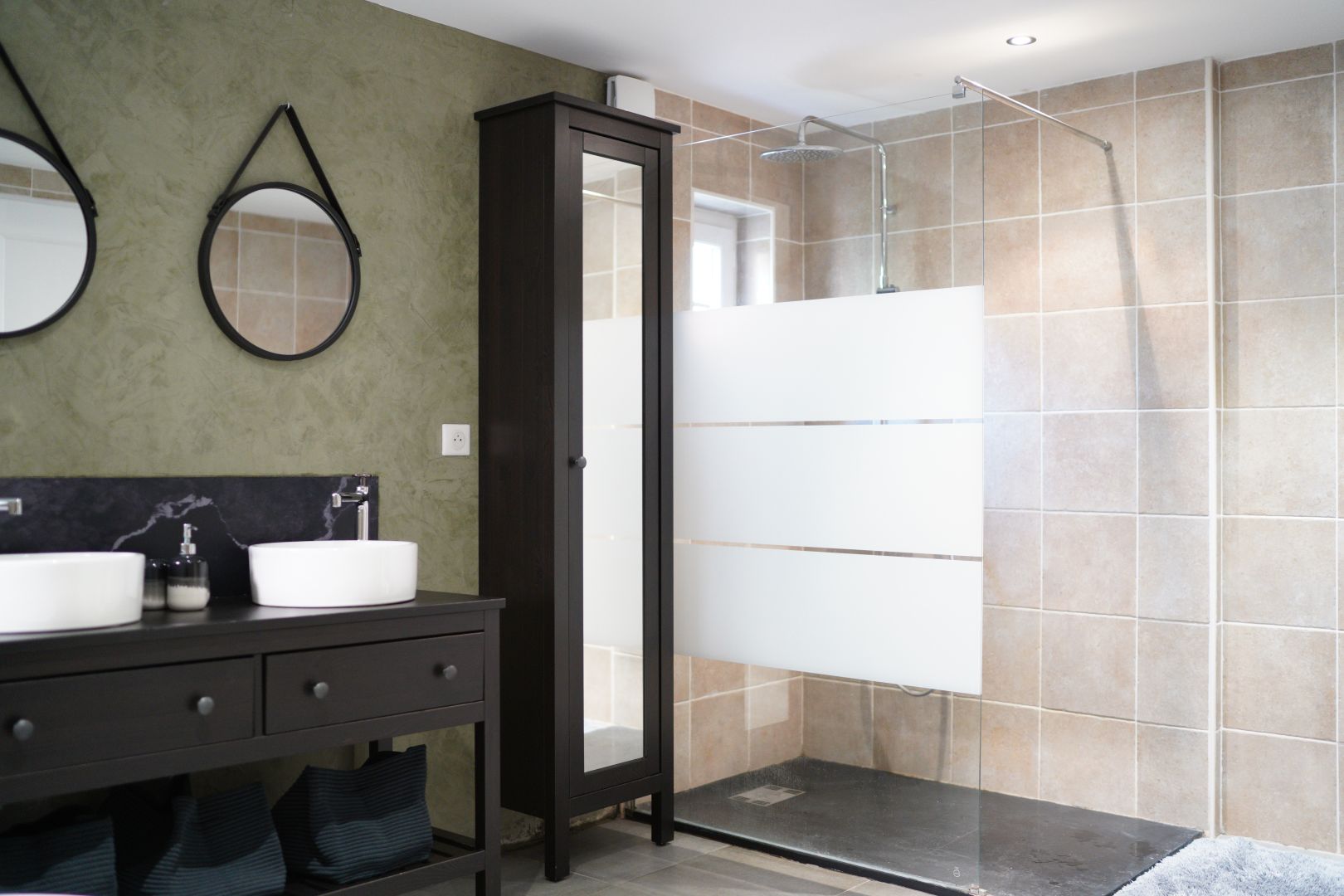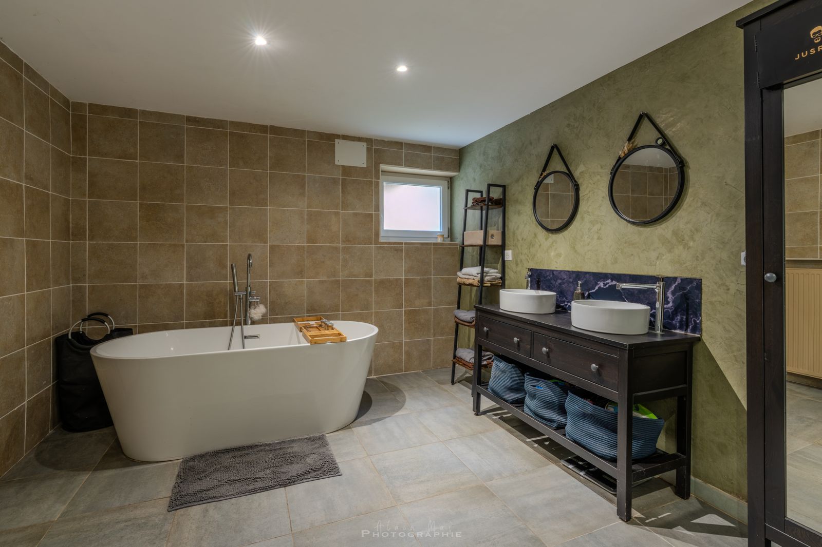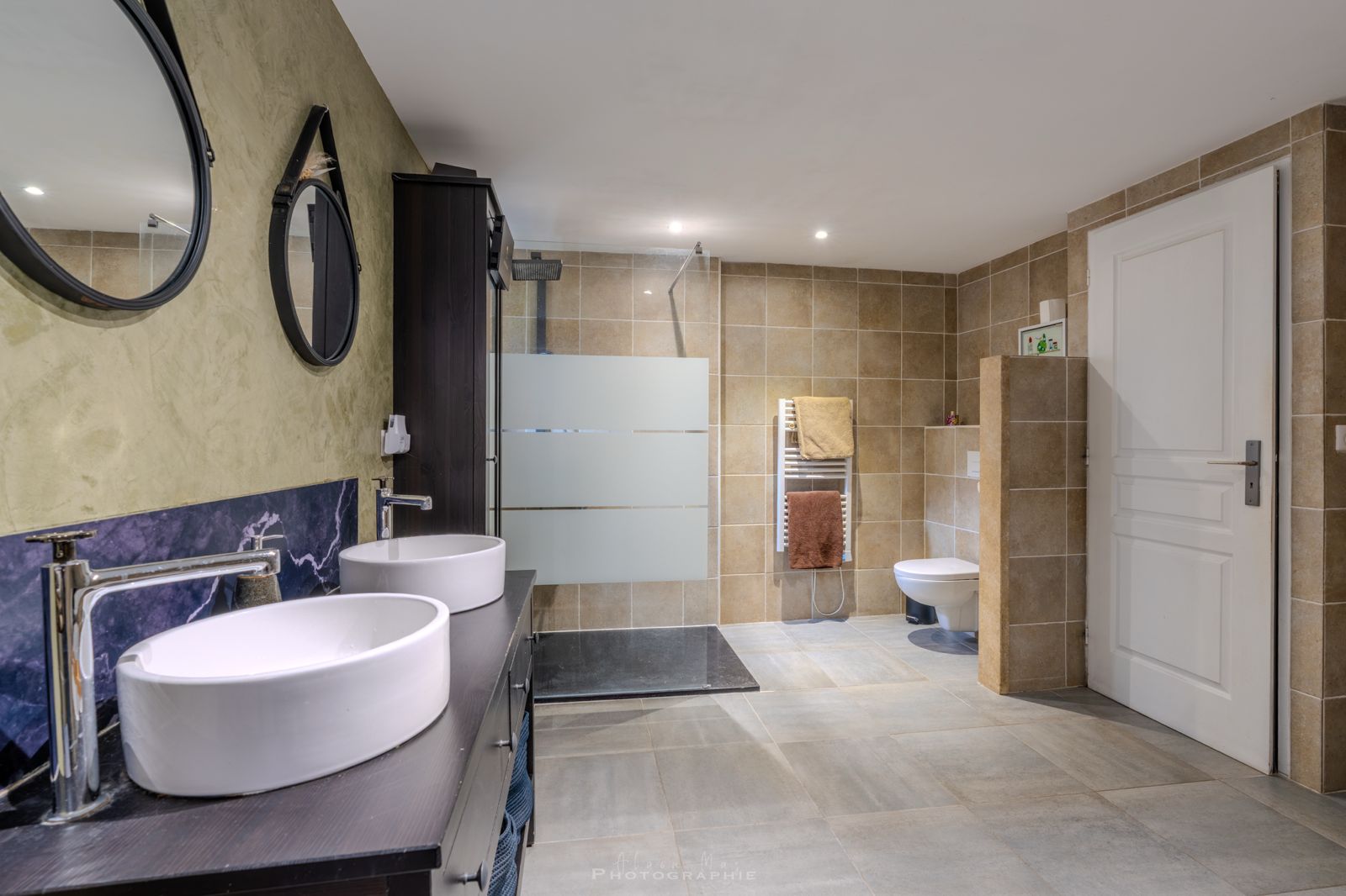- Salle(s) de bains 12,85m2 Baignoire, douche italienne, double vasque, wc, radiateur Sèche serviette;