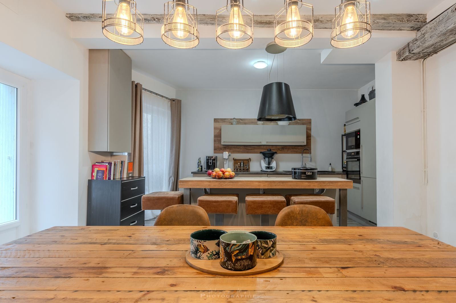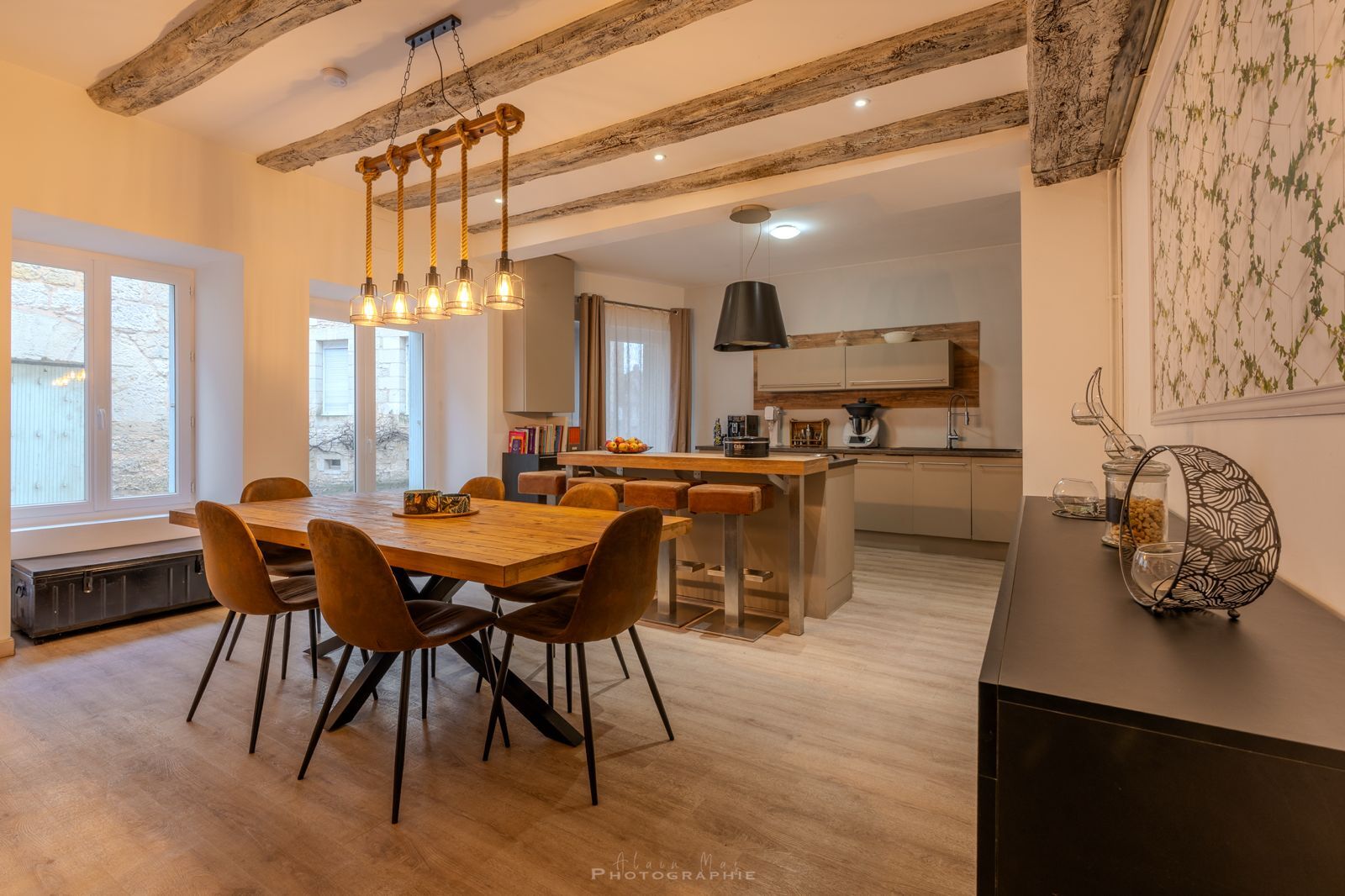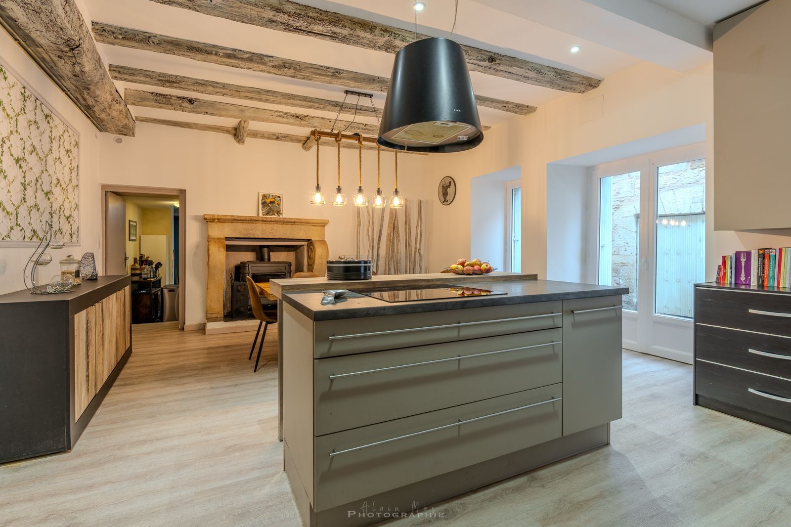 - Cuisine(s) Cuisine/Salle à manger 30m2, cheminée avec poêle, cuisine aménagée et équipée avec ilot.