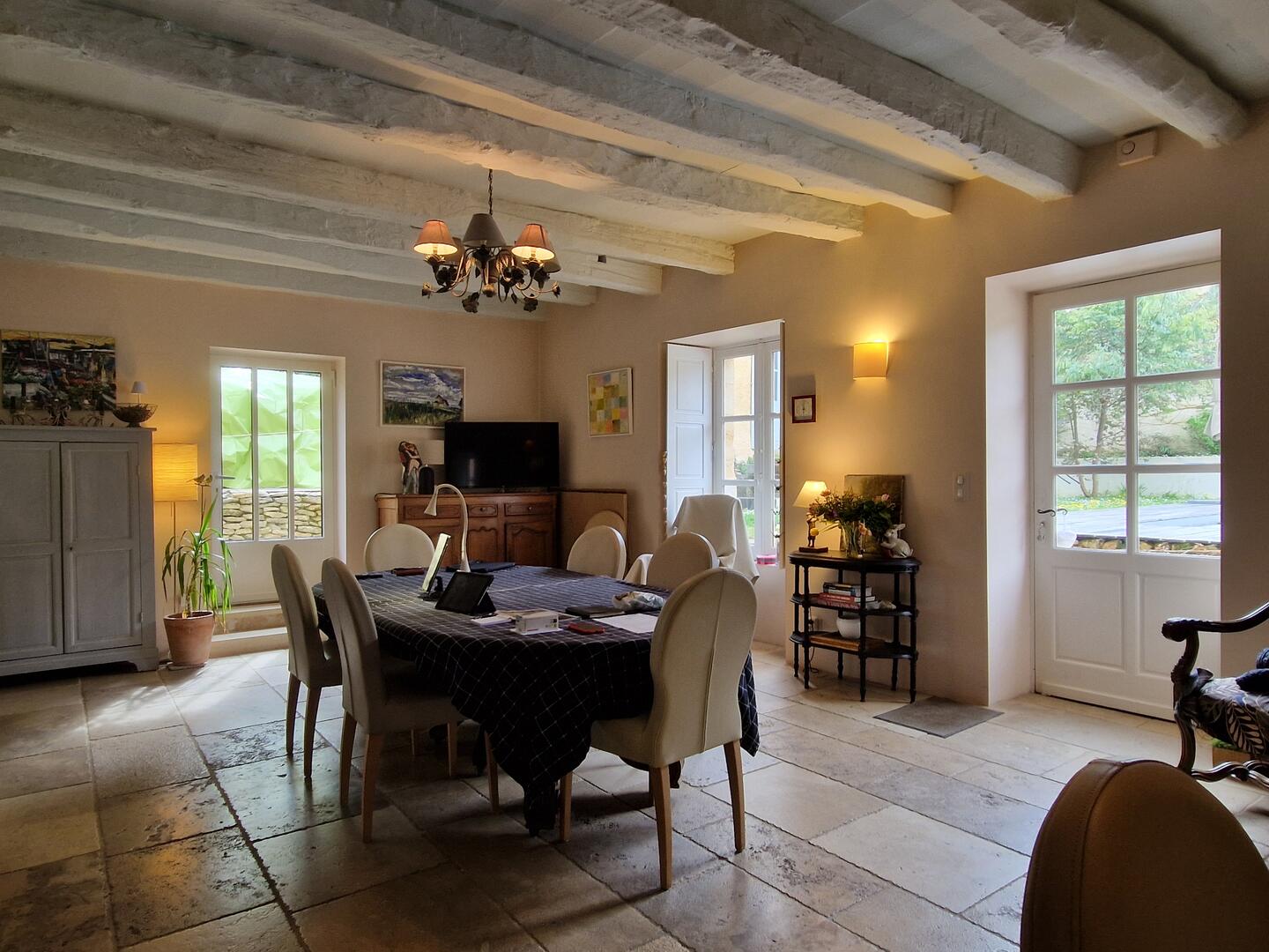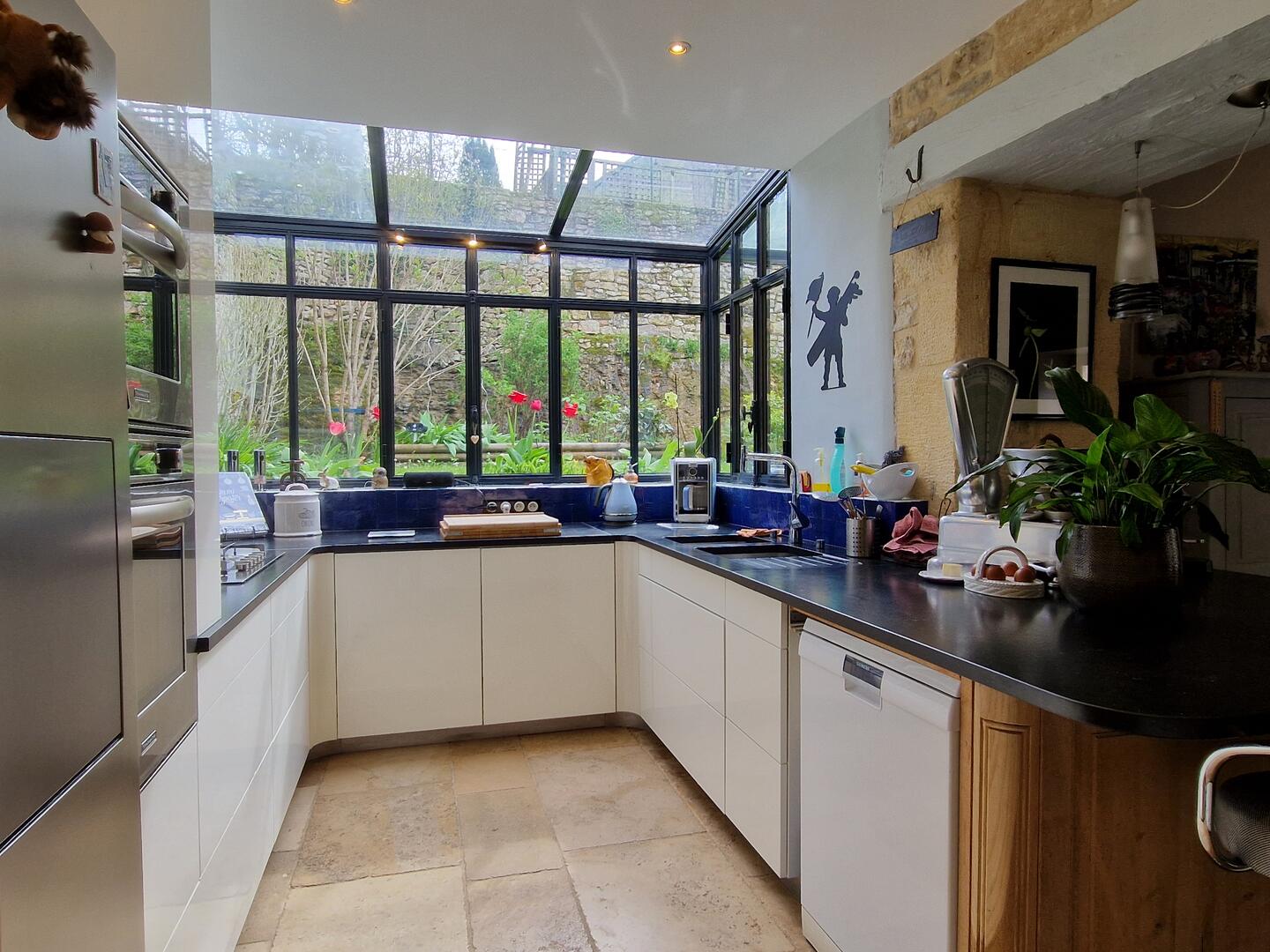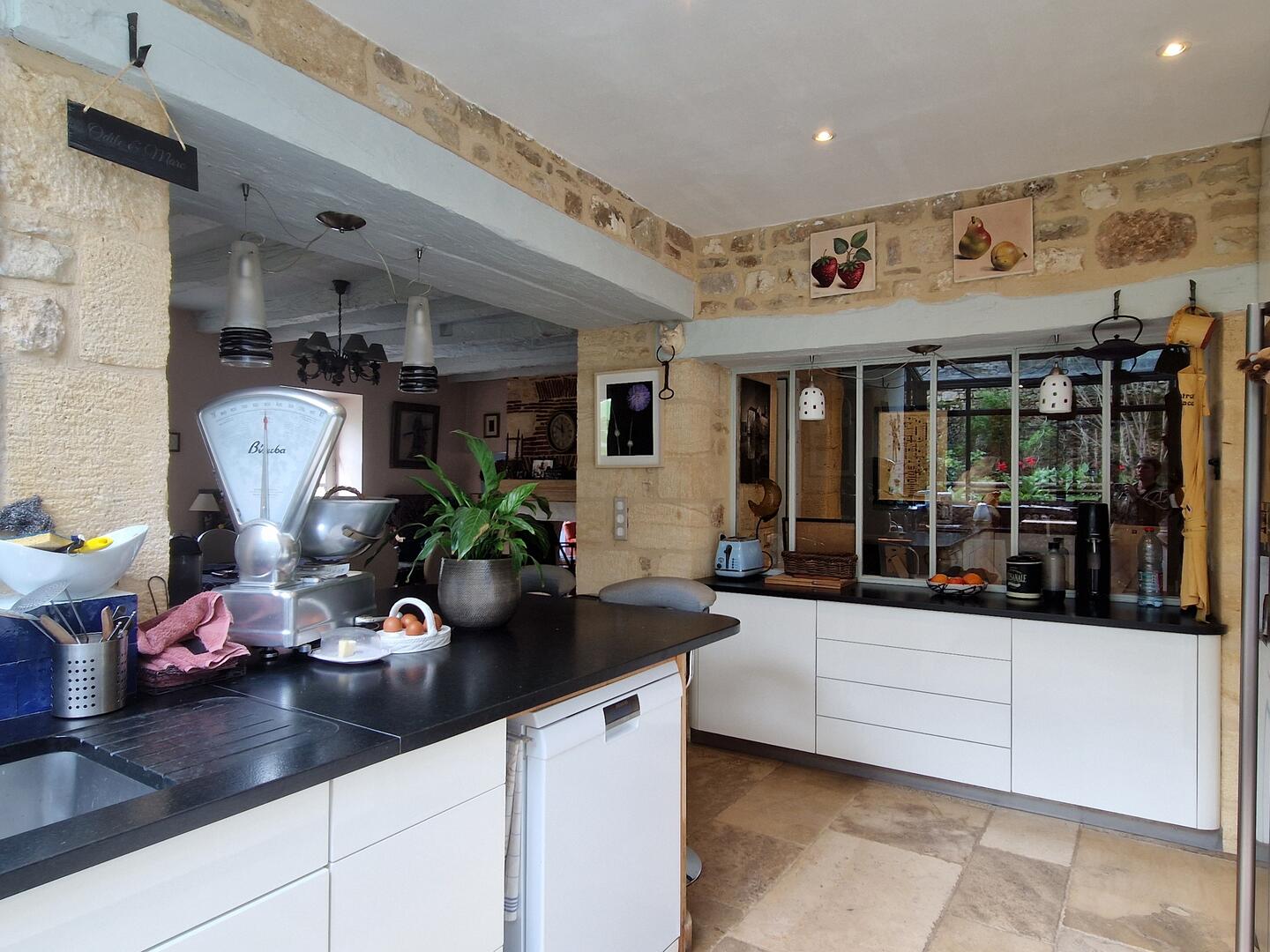 - Cuisine(s) 13m2 aménagée et équipée plan granit, sol travertin, Plaque 5 feux gaz, 2 fours