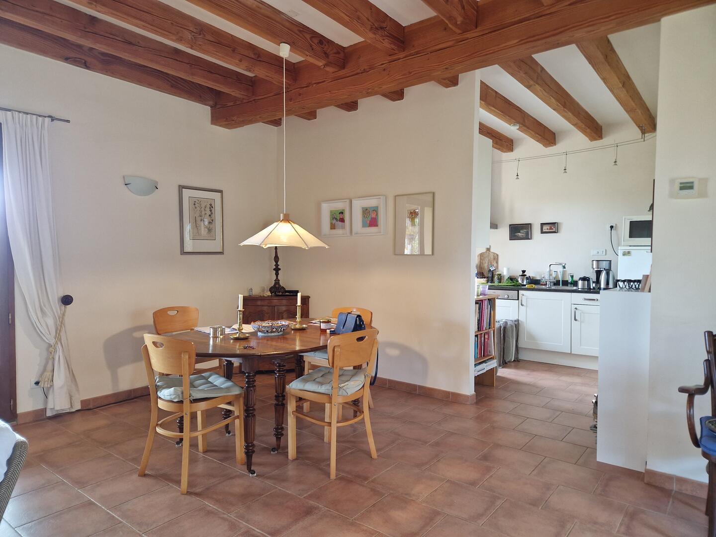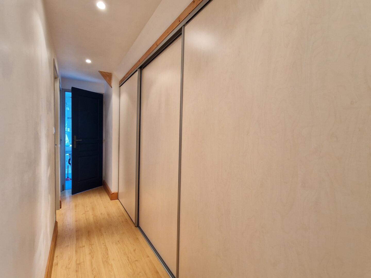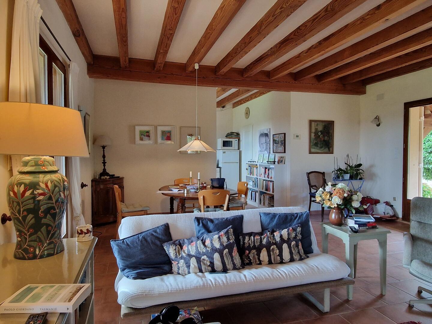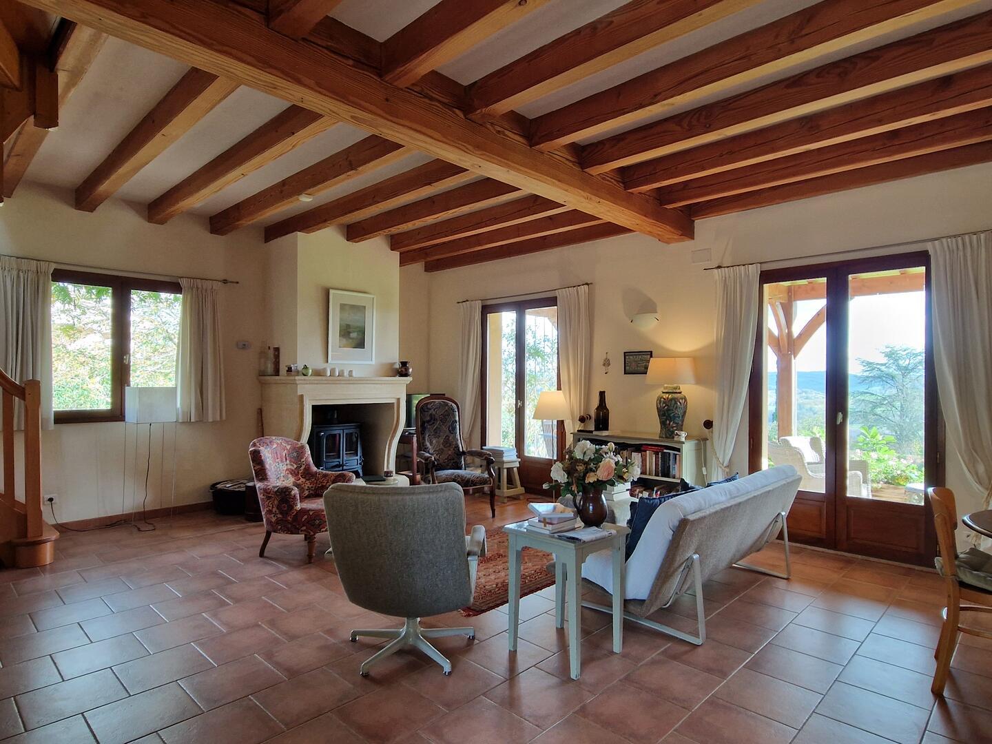 - Pièce(s) à vivre 44m2 plafond poutres, Escalier bois vers étage, cheminée avec poêle, portes fenêtres vers terrasse couverte au Sud avec Vue sur la Vallée.