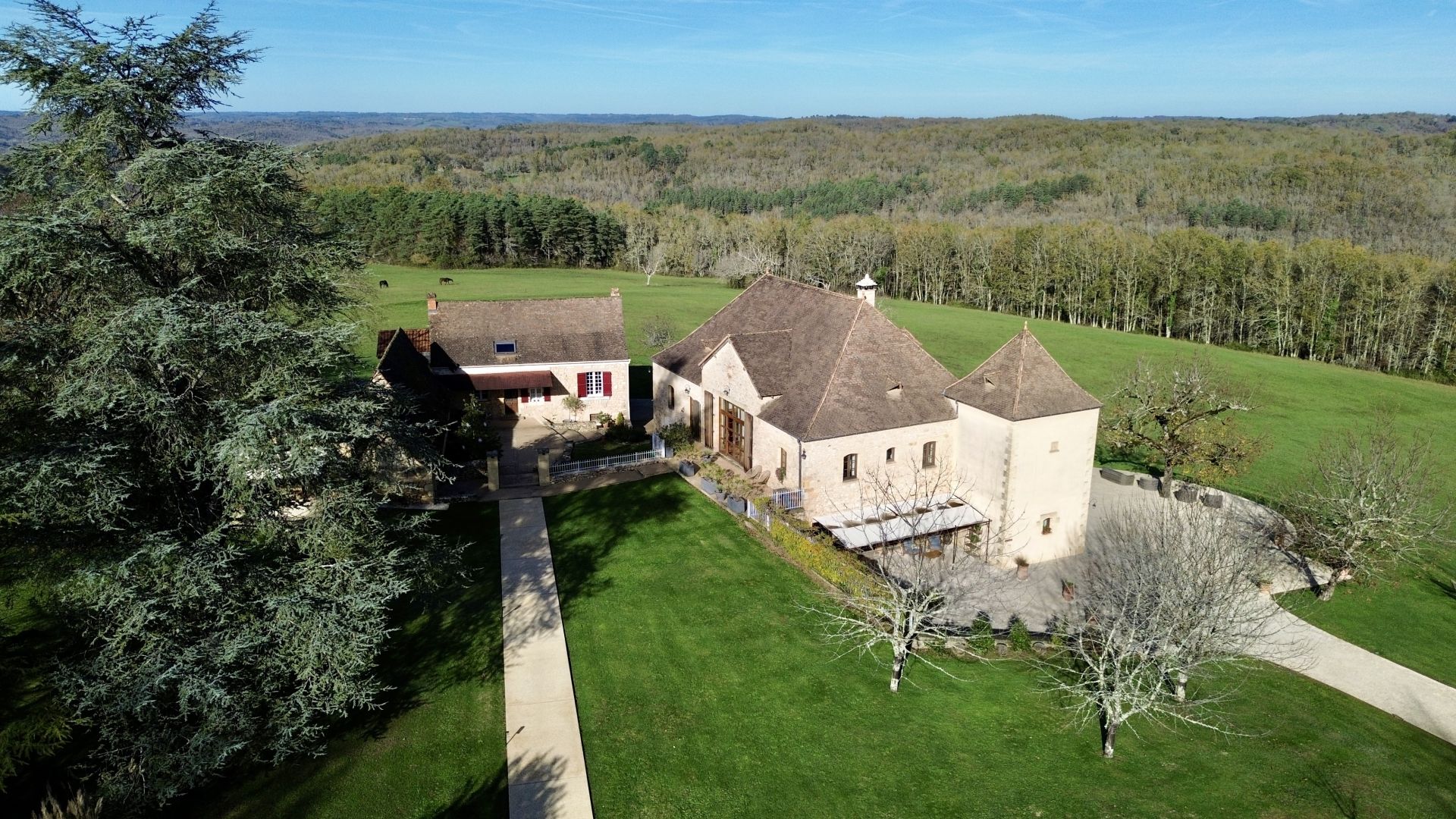 Propriété d'exception en Périgord Noir avec vue époustouflante, 5 chambres d'hôtes, 1 gîte avec 2 chambres, 1 studio, 1 piscine et 27 hectares de forêts et prairies