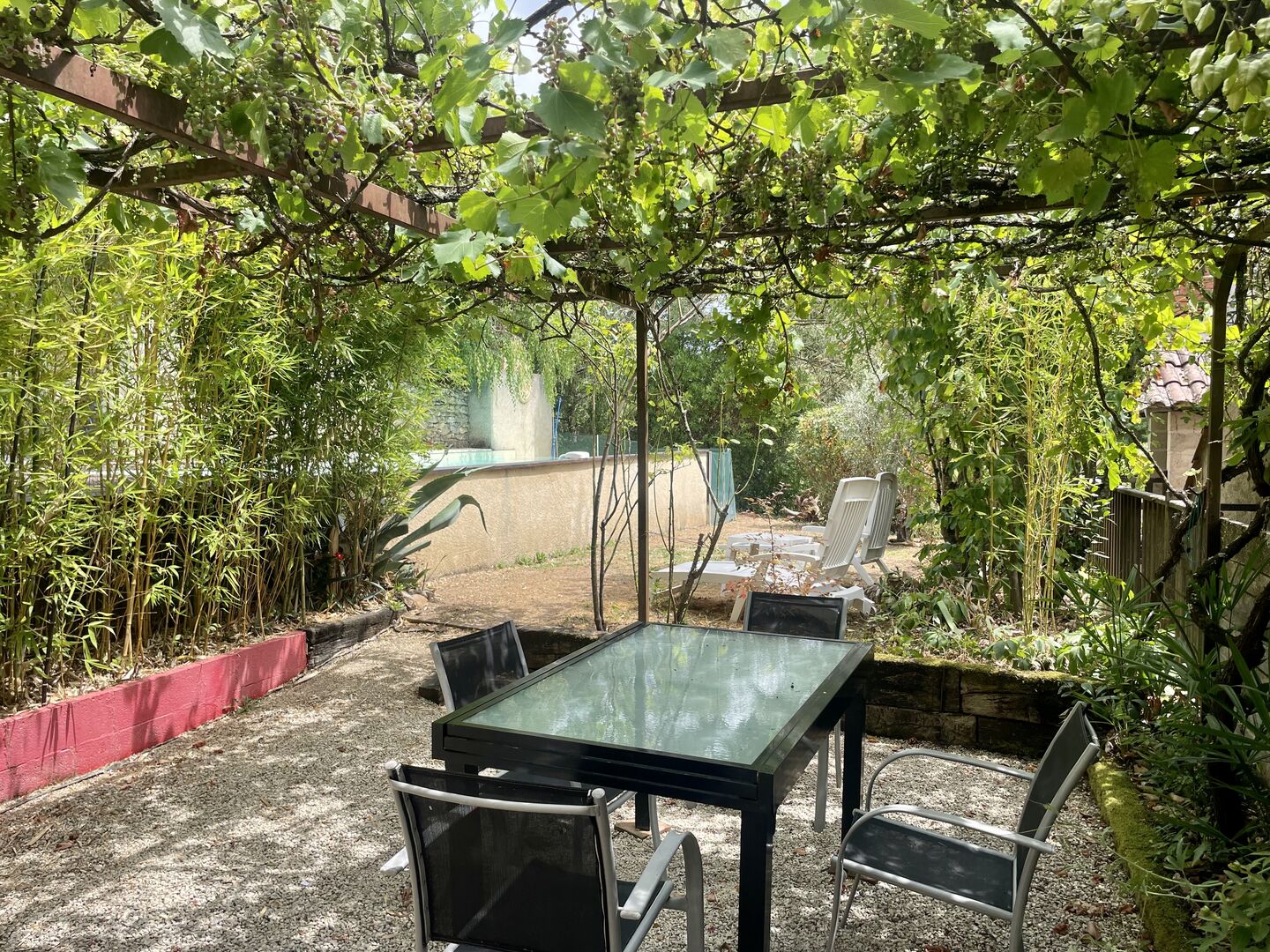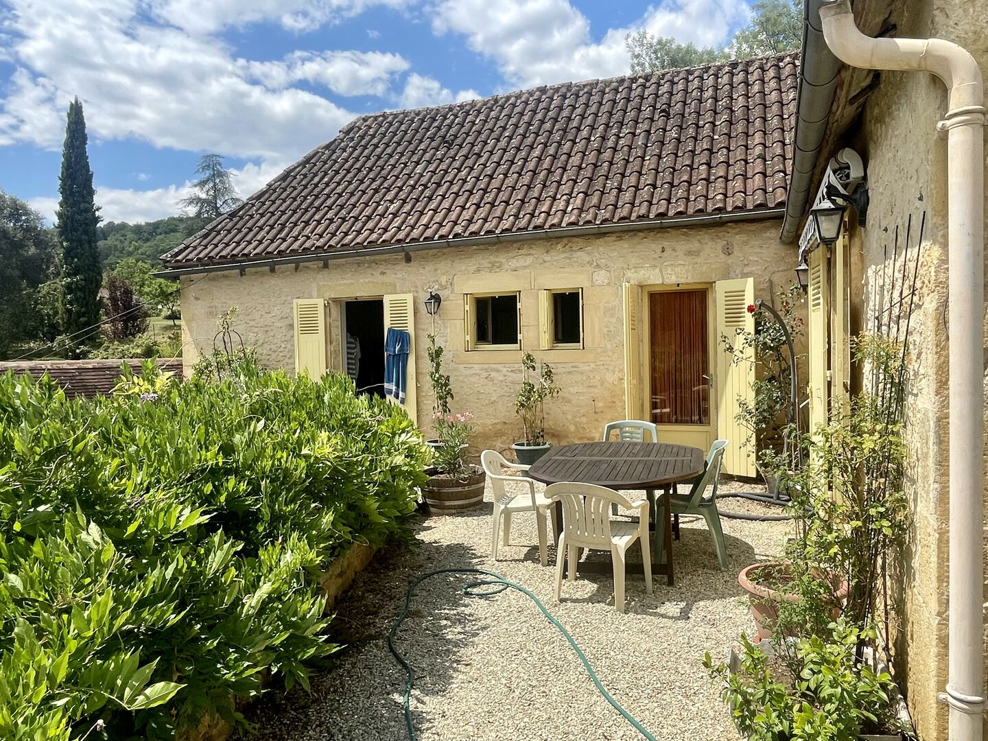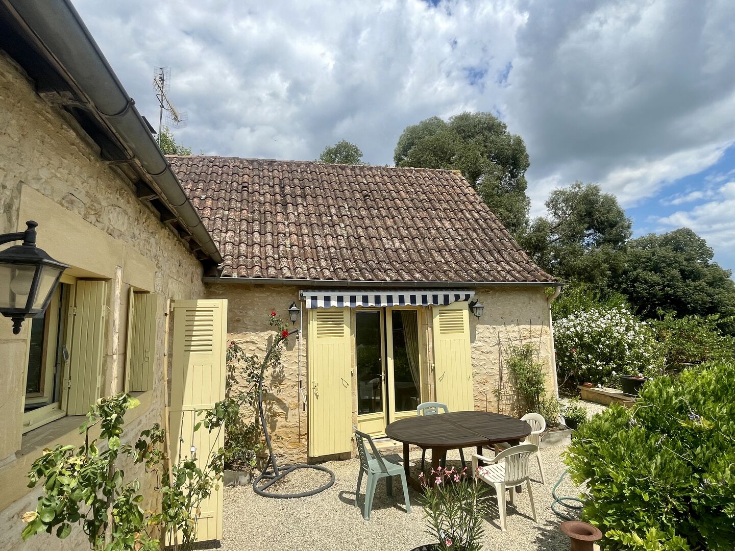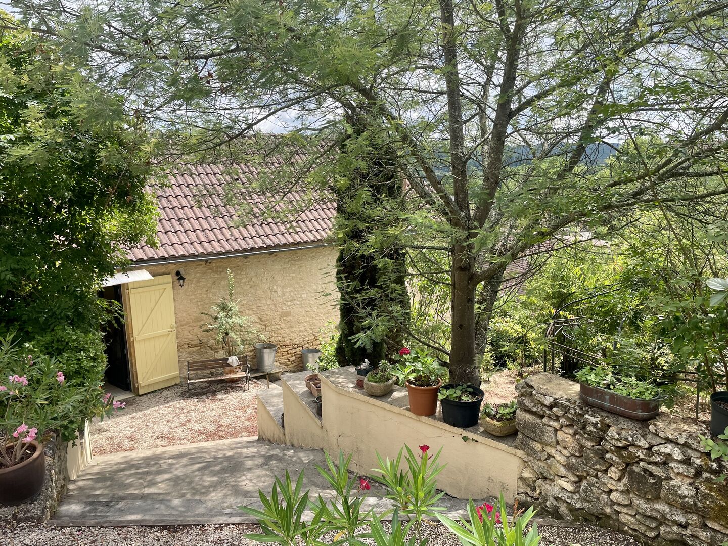 Sur les hauteurs de Montignac-Lascaux, maison ancienne avec gîte, garage et piscine sur 1500 m² de terrain. Jardin plein de charme et vue exceptionnelle sur le village!